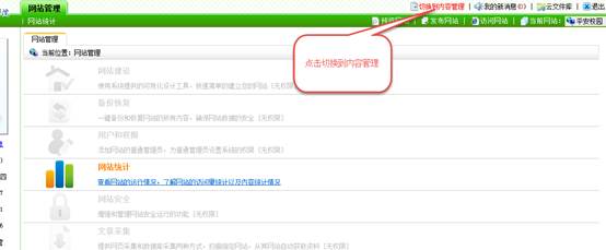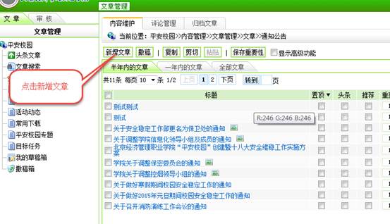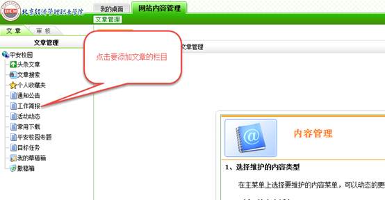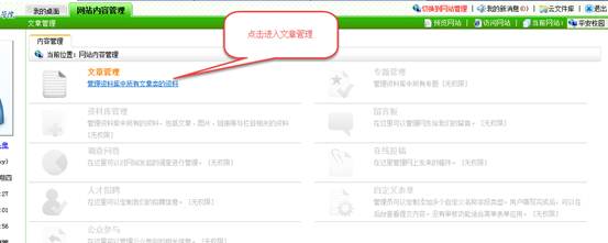 点击栏目后,进入内容维护标签页,点击“新增文章”